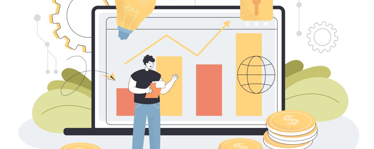 Tiny person with modern fintech or finance services method. Tablet for investing in startups or foreign currency online flat vector illustration. Economy, digital technology for business concept